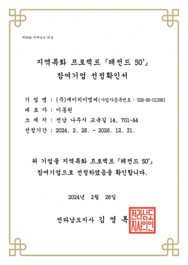 지역특화 프로젝트 『레전드 50+』 참여기업 선정확인서